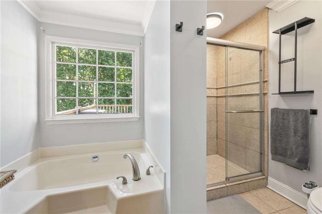 The primary suite on the main level offers privacy and calm, complete with a nicely appointed bath, soaking tub, separate shower, and all the peace you need to unwind.