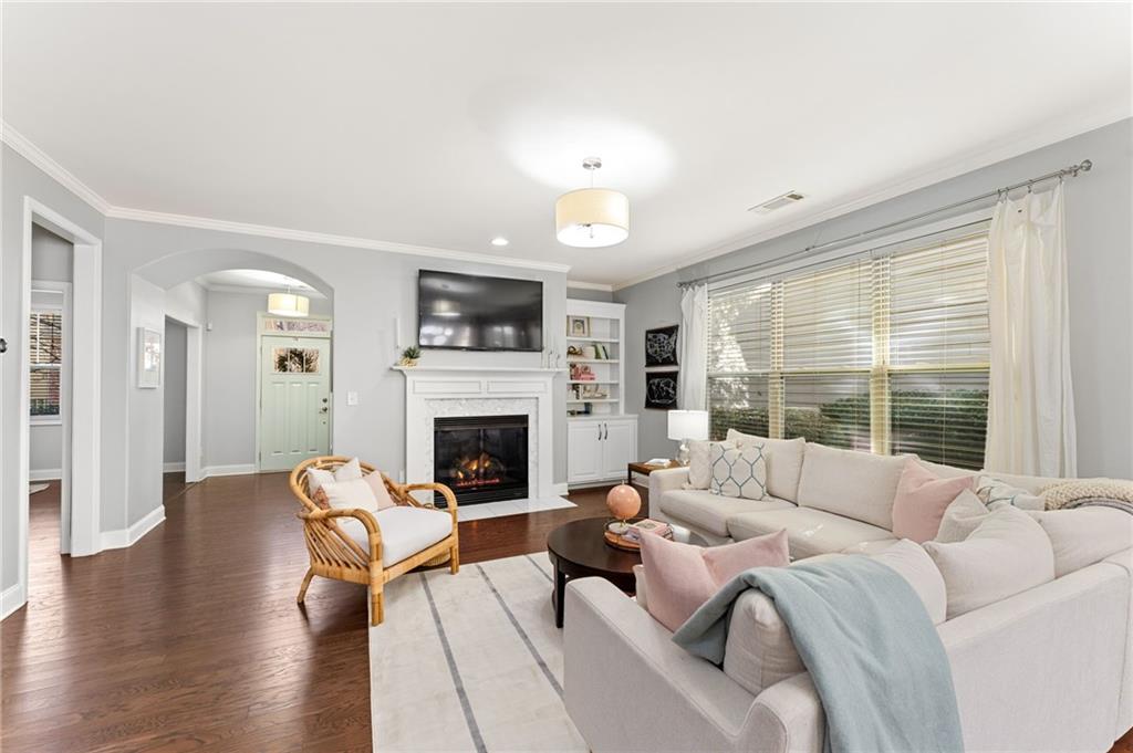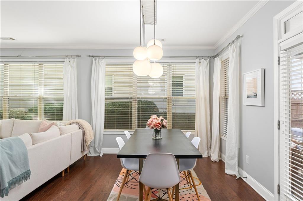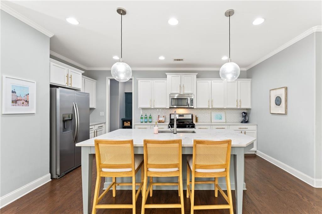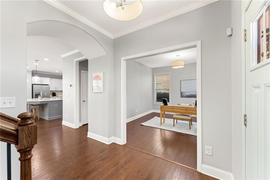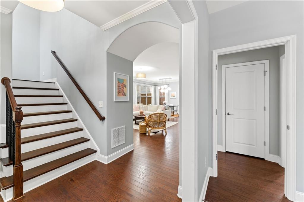 From the moment you arrive, the charming tree-lined streetscape and inviting portico entry set the tone. Inside, gleaming wood floors, upgraded lighting, iron balusters, and architectural detailing create a warm, refined atmosphere throughout the main level.