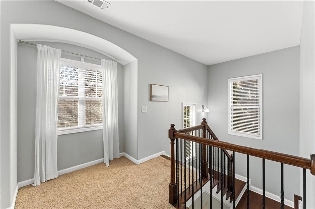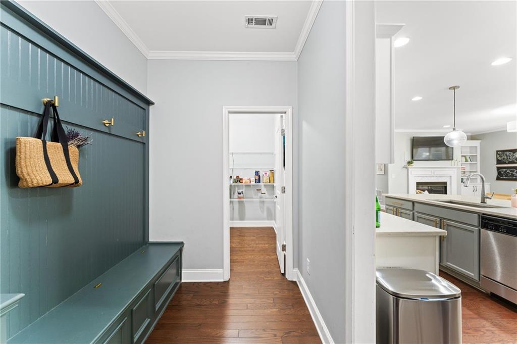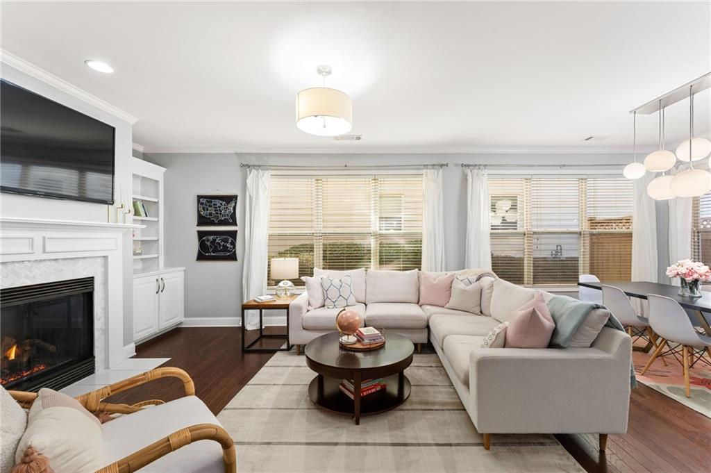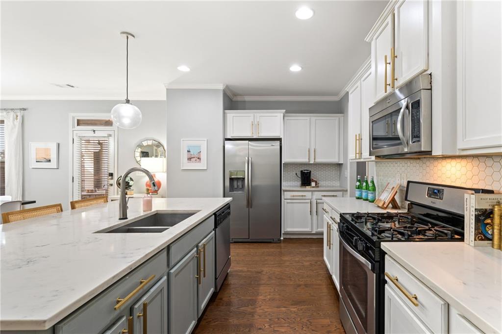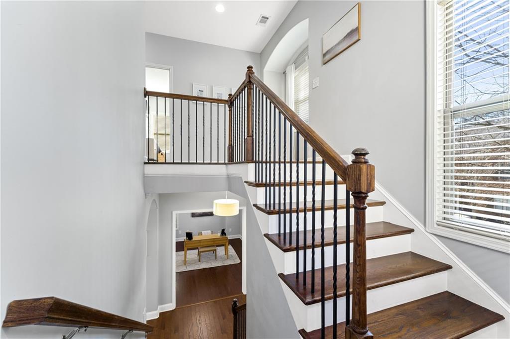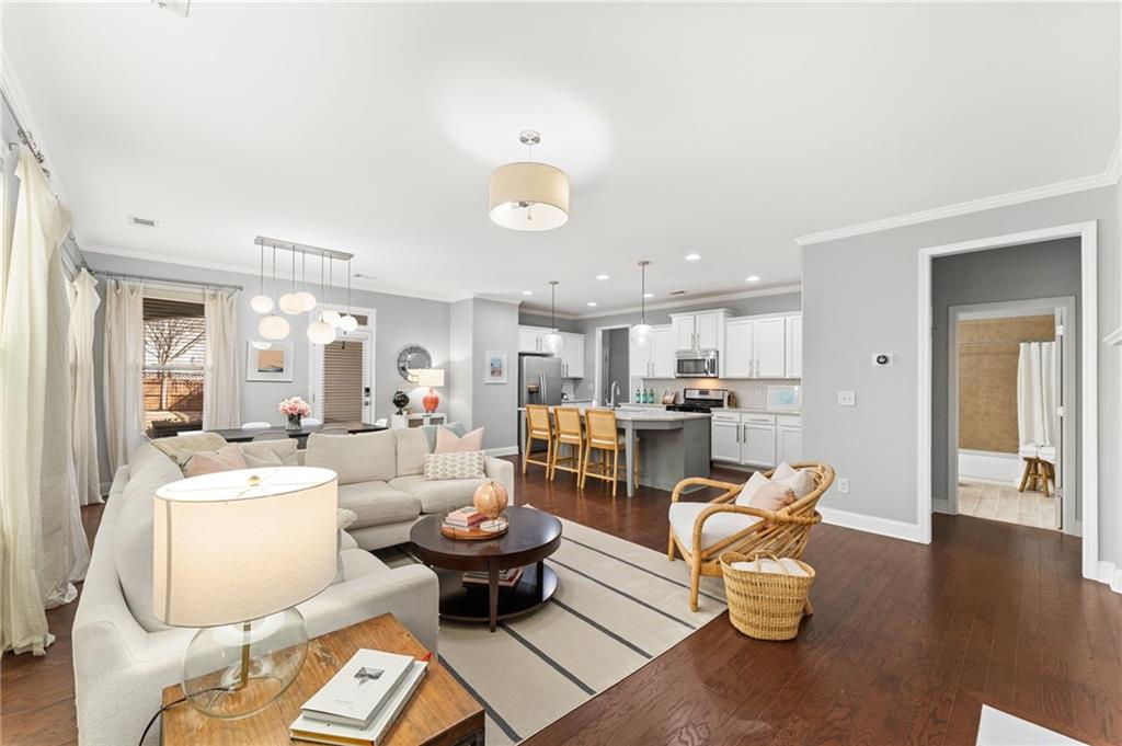 From the moment you arrive, the charming tree-lined streetscape and inviting portico entry set the tone. Inside, gleaming wood floors, upgraded lighting, iron balusters, and architectural detailing create a warm, refined atmosphere throughout the main level.