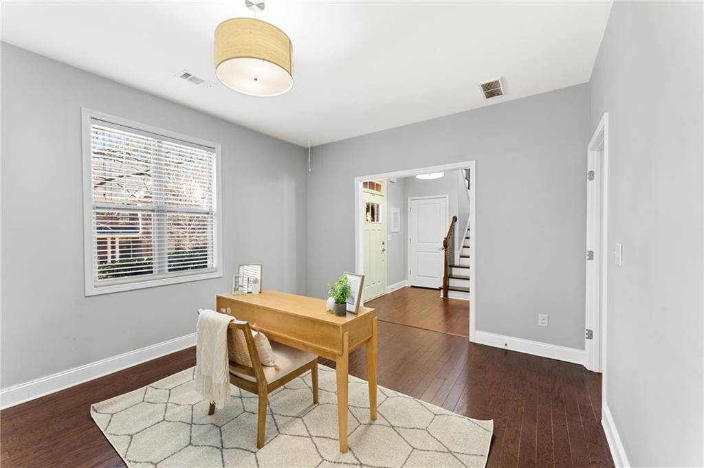 One of the home's standout features is the main-level bedroom option, currently styled as a home office but complete with a full bath and closet. Whether you need guest accommodations, multi-generational flexibility, or simply a private workspace, this space adapts beautifully.