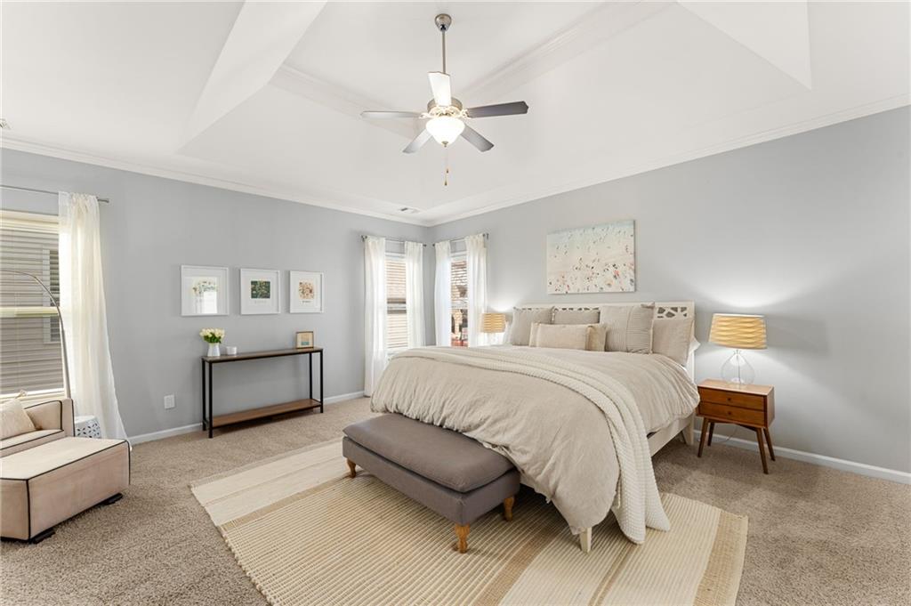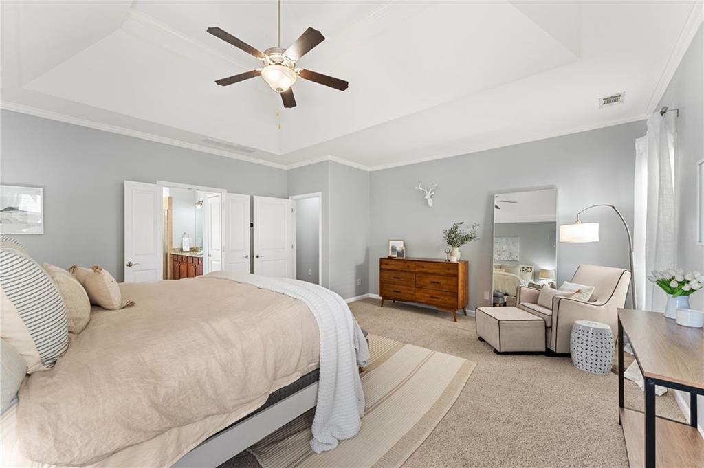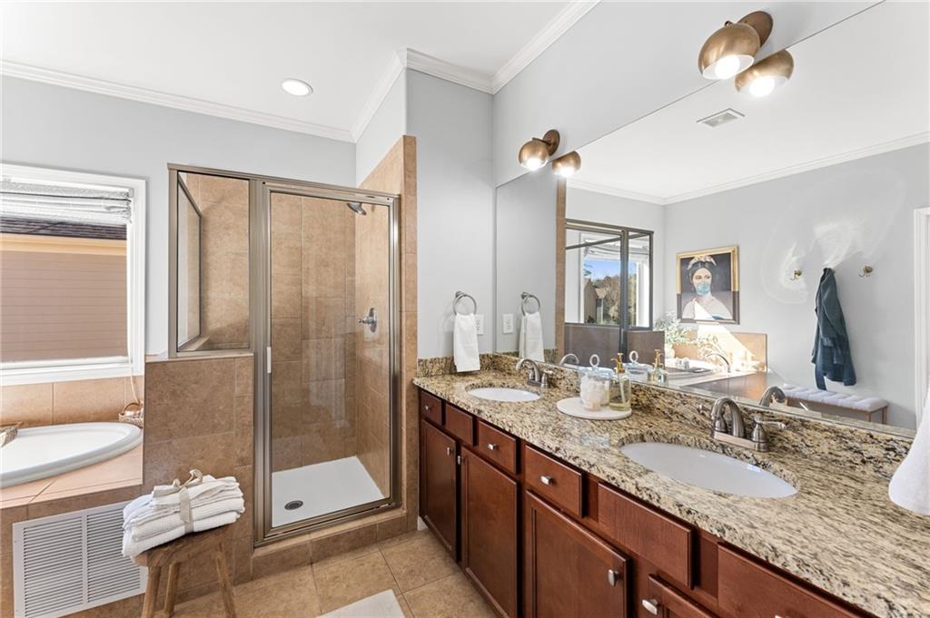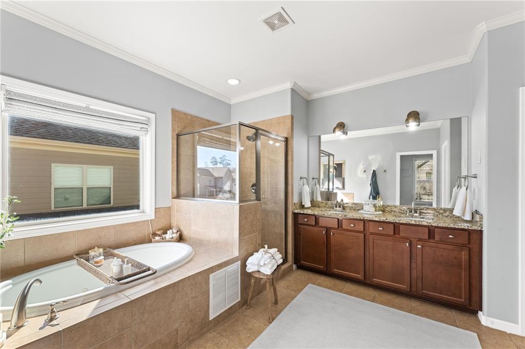 Upstairs, the oversized primary suite provides a peaceful retreat with high ceilings, crown molding, and a spacious walk-in closet. The ensuite bath features tile flooring, dual vanities, soaking tub, and a large tile shower. Three additional bedrooms and two full baths offer comfort and flexibility for guests, hobbies, or growing needs.